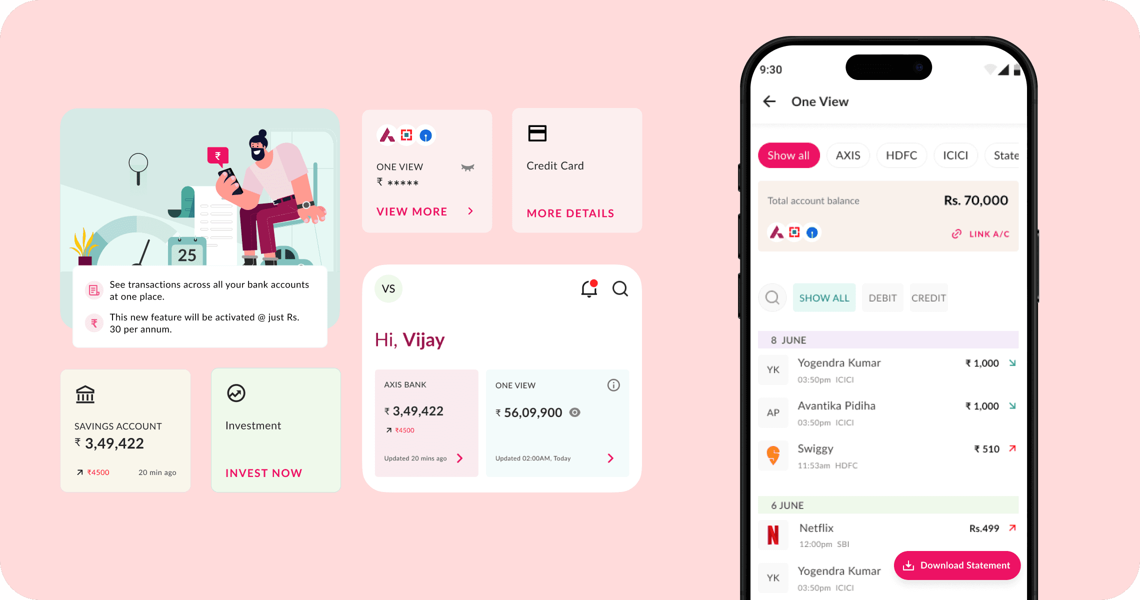 Managing multiple bank accounts can be cumbersome, as people need to access each bank’s app to check available funds, review statements, or track refunds. To simplify this, we created One View, giving users a centralized space to track, manage, and download all their bank statements with ease.